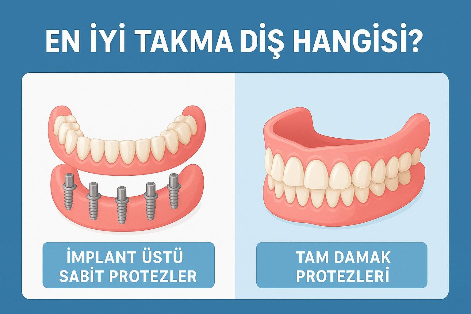 İki farklı takma diş türünü gösteren kare infografik: Solda implant üstü sabit protezler, sağda tam damak protezleri yer alıyor. Üstte büyük puntoyla